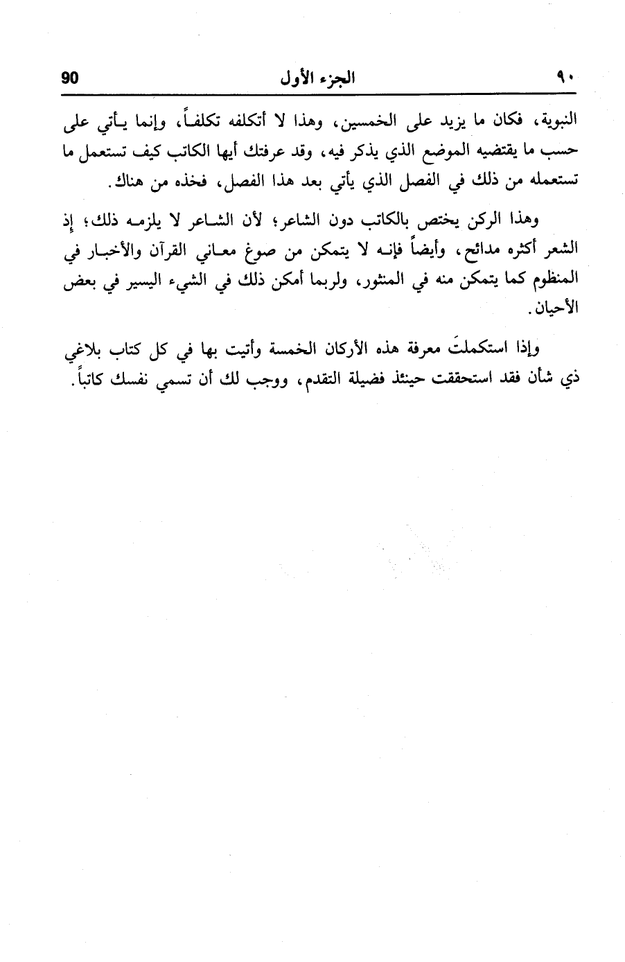 وإذا استكملت معرفة هذه الأركان الخمسة وأتيت بها في كل كتاب بلاغي ذي شأن فقد استحققت حينئذ فضيلة التقدم، ووجب لك أن تسمي نفسك كاتبا.