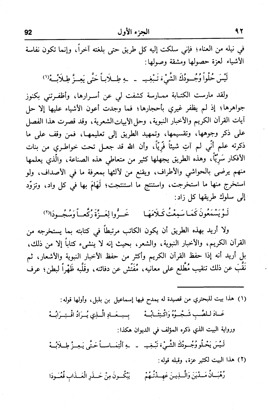 ولا أريد بهذه الطريق أن يكون الكاتب مرتبطا في كتابته بما يستخرجه من القرآن الكريم، والأخبار النبوية، والشعر، بحيث إنه لا ينشىء كتابا إلا من ذلك، بل أريد أنه إذا حفظ القرآن الكريم وأكثر من حفظ الأخبار النبوية والأشعار، ثم نقّب عن ذلك تنقيب مطّلع على معانيه، مفتّش عن دفائنه، وقلّبه ظهرا لبطن؛ عرف