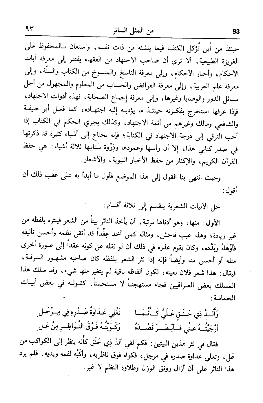 حينئذ من أين تؤكل الكتف فيما ينشئه من ذات نفسه، واستعان بالمحفوظ على الغريزة الطبيعية، ألا ترى أن صاحب الاجتهاد من الفقهاء يفتقر إلى معرفة آيات الأحكام، وأخبار الأحكام، وإلى معرفة الناسخ والمنسوخ من الكتاب والسنّة، وإلى معرفة علم العربية، وإلى معرفة الفرائض والحساب من المعلوم والمجهول من أجل مسائل الدور والوصايا وغيرها، وإلى معرفة إجماع الصحابة، فهذه أدوات الاجتهاد، فإذا عرفها استخرج بفكرته حينئذ ما يؤديه إليه اجتهاده، كما فعل أبو حنيفة والشافعي ومالك وغيرهم من أئمة الاجتهاد، وكذلك يجري الحكم في الكتاب إذا أحب الترقي إلى درجة الاجتهاد في الكتابة؛ فإنه يحتاج إلى أشياء كثيرة قد ذكرتها في صدر كتابي هذا، إلا أن رأسها وعمودها وذروة سنامها ثلاثة أشياء: هي حفظ القرآن الكريم، والإكثار من حفظ الأخبار النبوية، والأشعار.