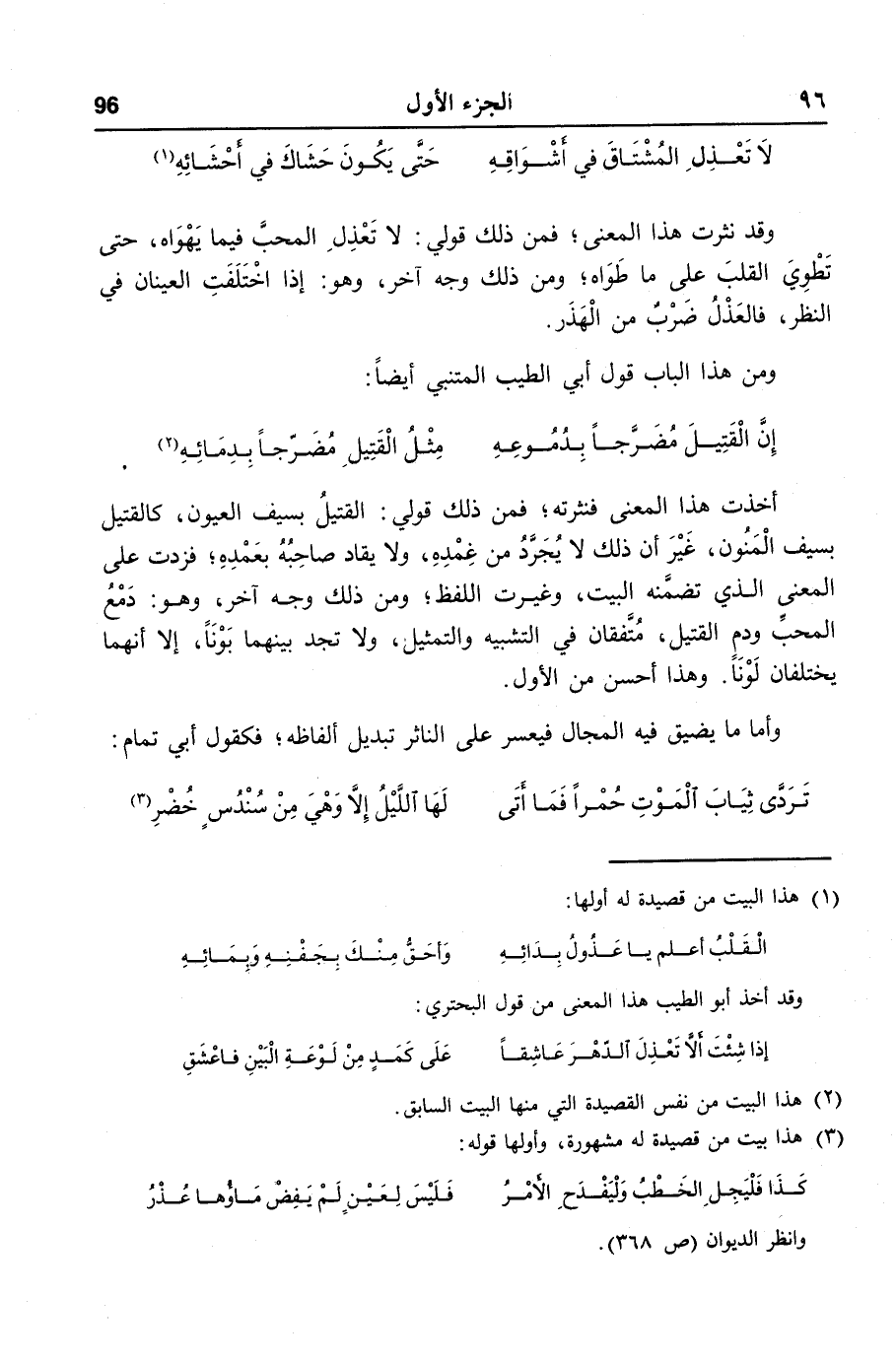 أخذت هذا المعنى فنثرته؛ فمن ذلك قولي: القتيل بسيف العيون، كالقتيل بسيف المنون، غير أن ذلك لا يجرّد من غمده، ولا يقاد صاحبه بعمده؛ فزدت على المعنى الذي تضمّنه البيت، وغيرت اللفظ؛ ومن ذلك وجه آخر، وهو: دمع المحبّ ودم القتيل، متّفقان في التشبيه والتمثيل، ولا تجد بينهما بونا، إلا أنهما يختلفان لونا. وهذا أحسن من الأول.