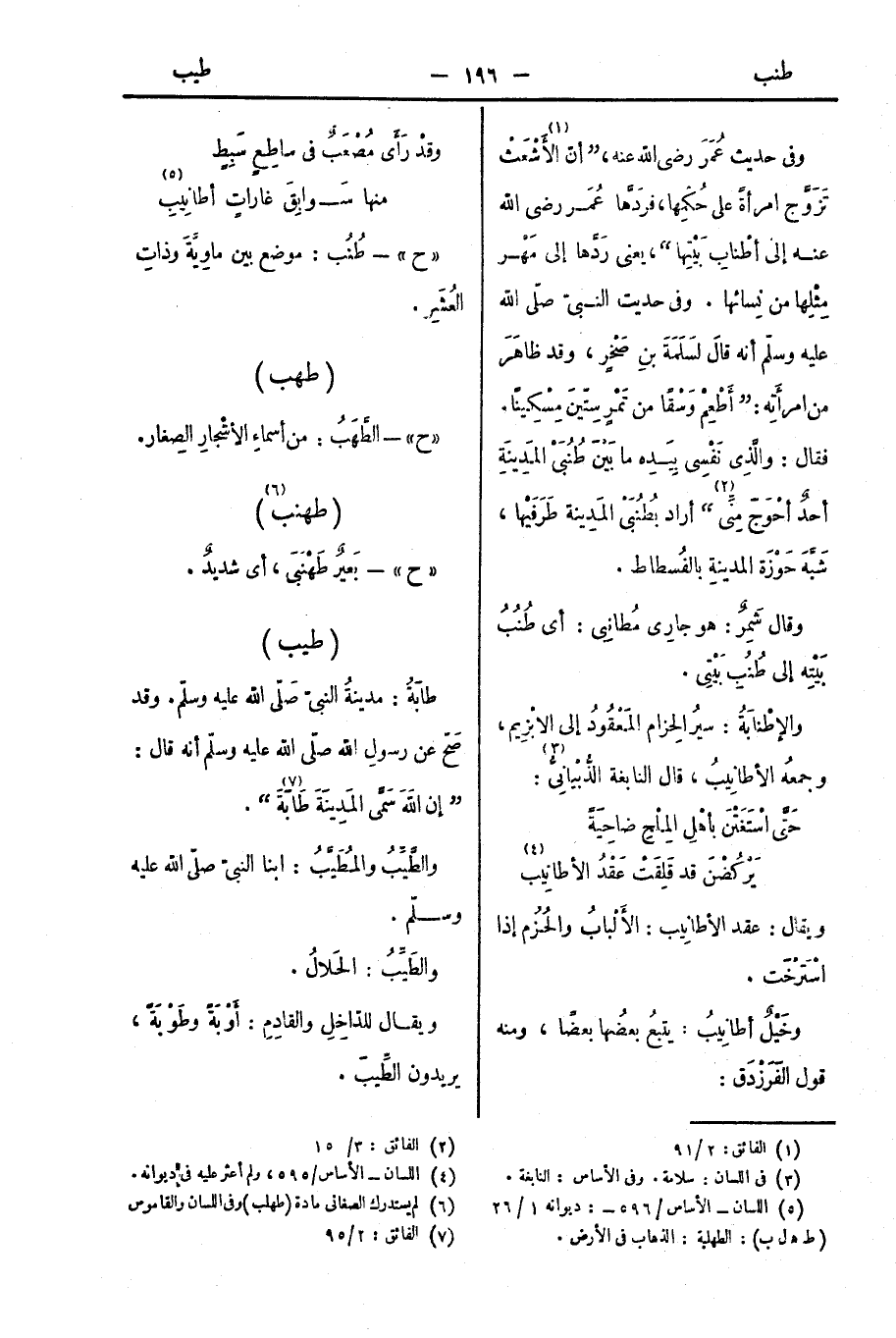 وفي حديث عُمَرَ رضي الله عنه " أنّ الأَشْعَثَ تَزَوَّج امرأةً على حُكْمِها، فرَدَّها عُمَر رضي الله عنه إلى أطْنابِ بَيْتِها "، يعني رَدَّها إلى مَهْر مِثْلِها من نِسائها. وفي حديث النبيّ صلى الله عليه وسلم أنه قالَ لسَلَمَةَ بنِ صَخْرٍ، وقد ظاهَرَ من امرأَتِه: " أَطْعِمْ وسْقًا من تَمْرٍ سِتّينَ مِسْكِينًا. فقال: والَّذِي نَفْسِي بِيَدِه ما بَيْنَ طُنُبَيْ المَدِينَةِ أحدٌ أحْوَجَ مِنِّي " أراد بطُنُبَيْ المَدِينة طَرَفَيْها، شَبَّهَ حَوْزَة المدينةِ بالفُسطاط.