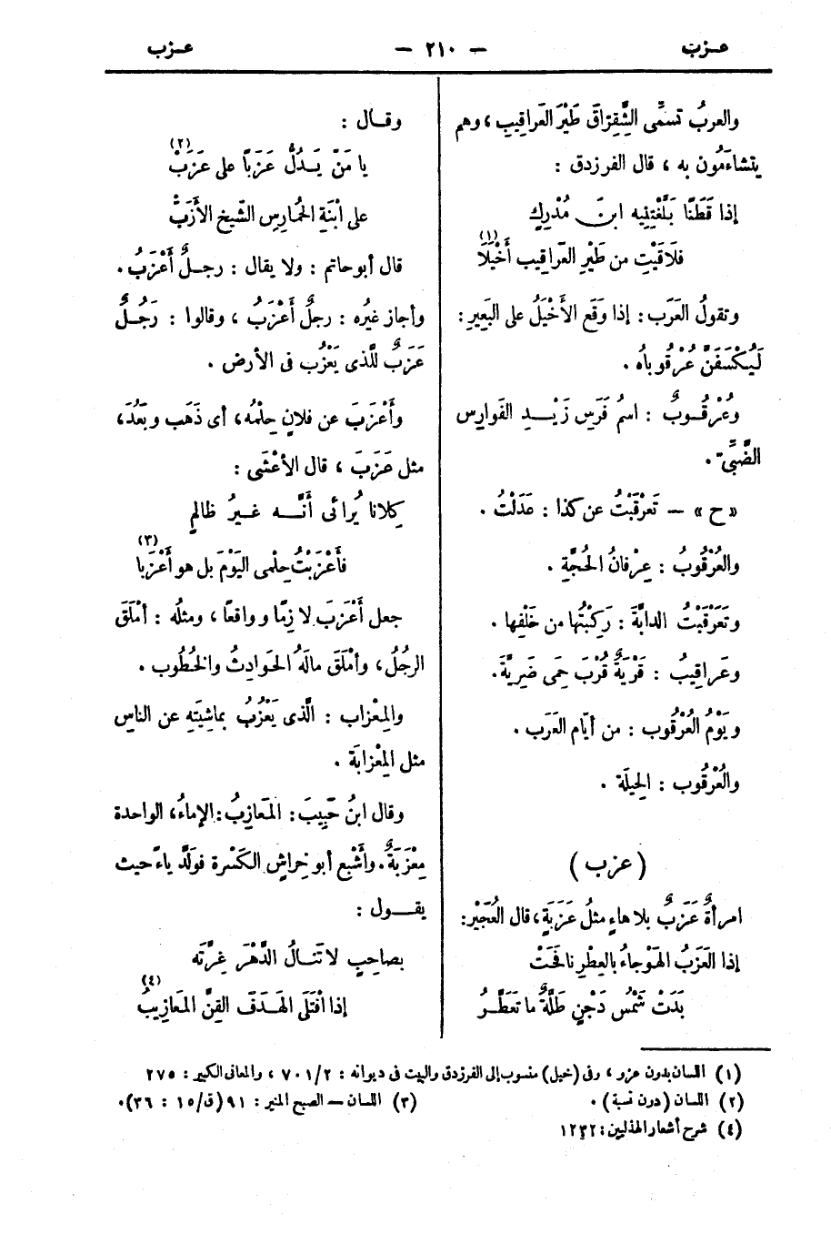 قال أبو حاتم: ولا يقال: رجلٌ أَعْزَبُ. وأجاز غيرُه: رجلٌ أَعْزَبُ، وقالوا: رَجُلٌ عَزَبٌ للَّذي يَعْزُب في الأرض.