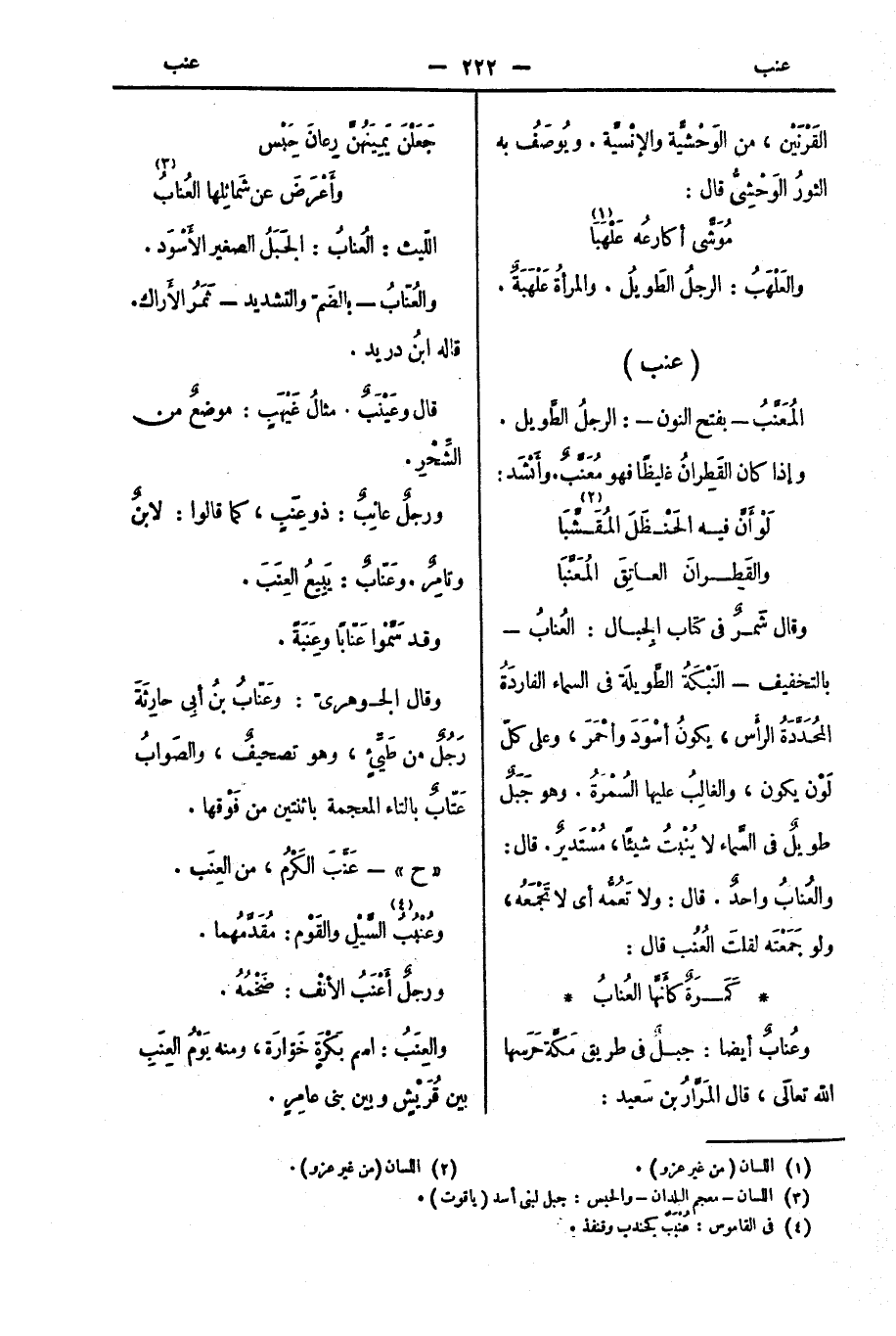 وقال شَمرٌ في كتاب الجِبال: العُنابُ بالتخفيف: النَبْكَةُ الطَّويلَة في السماء الفاردَةُ المُحَدَّدَةُ الرأْس، يكونُ أسْوَدَ وأحْمَرَ، وعلى كلّ لَوْن يكون، والغالِبُ عليها السُمْرَةُ. وهو جَبَلٌ طويلٌ في السَّماء لا يُنْبتُ شيئًا، مُسْتَديرٌ. قال: والعُنابُ واحدٌ. قال: ولا تَعُمُّه أي لا تَجْمَعُه، ولو جَمَعْتَه لقلتَ العُنُب، قال: