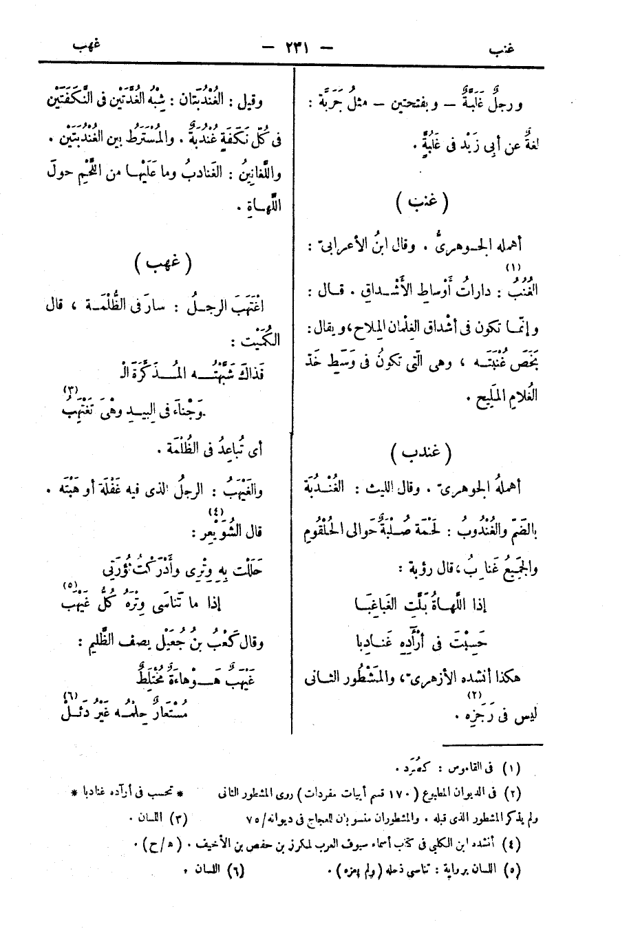 وقيل الغُنْدُبَتان: شِبْهُ الغُدَّتَيْن في النَّكَفَتَيْن في كُلّ نَكَفَةٍ غُنْدُبَةٌ. والمُسْتَرَطُ بين الغُنْدُبَتَيْن. واللَّغانِينُ: الغَنادبُ وما عَلَيْها من اللَّحْمِ حولَ اللَّهاةِ.