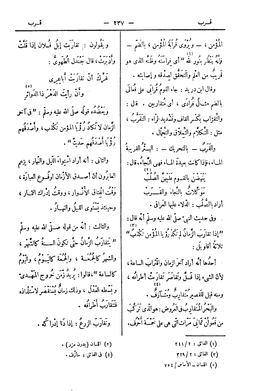 أحدُها أنَّه أراد آخرَ الزمان واقْترابَ الساعة، لأنّ الشيء إذا قَلَّ وتَقاصَرَ تَقارَبتْ أطرافُه، ومنه قيل للقَصير: مُتَقارِبٌ ومُتَآزفٌ.
