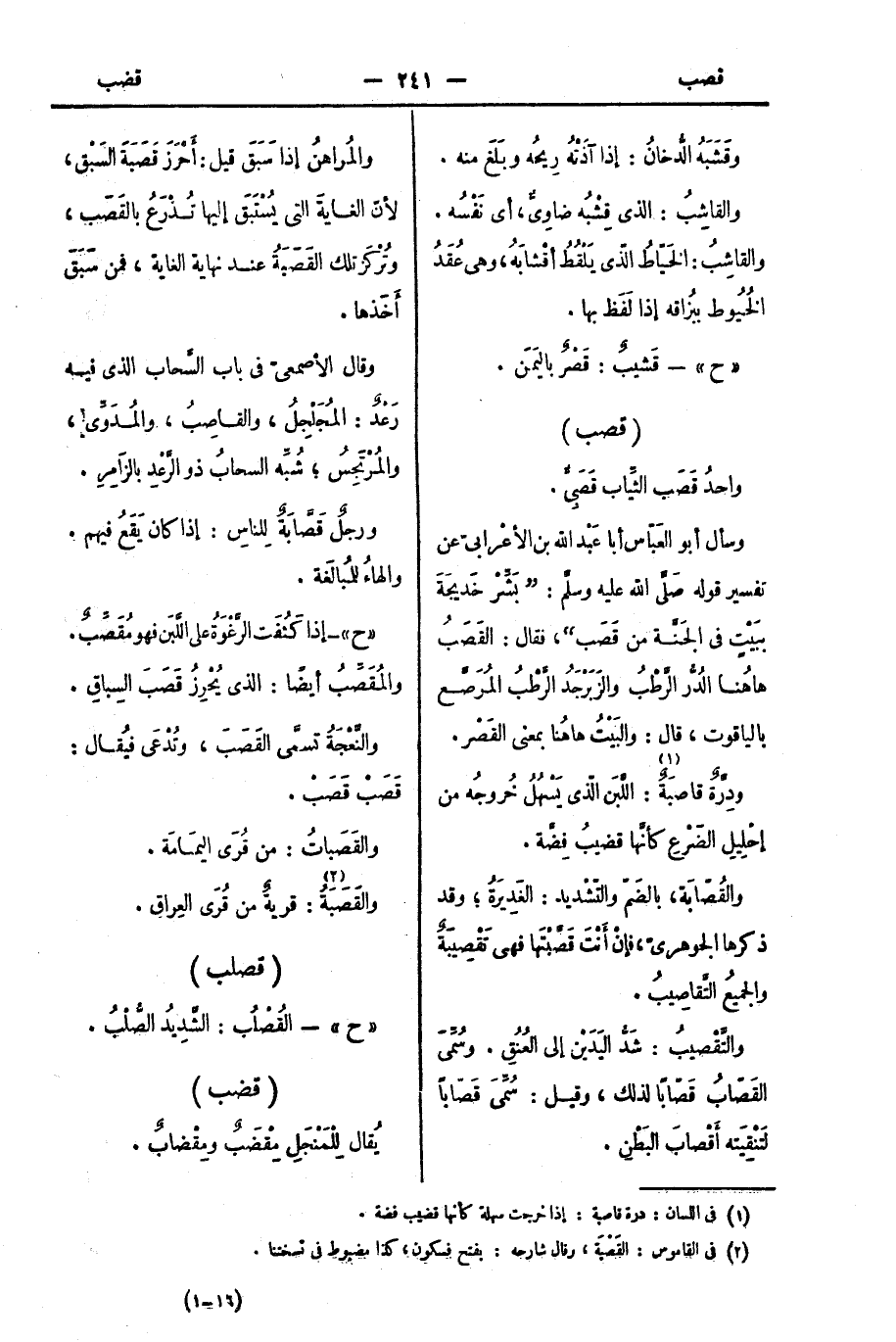 " ح " - إذا كَثُفَت الرَّغْوَةُ على اللَّبَن فهو مُقَصِّبٌ. والمُقَصِّبُ أيضًا: الذي يُحْرِزُ قَصَبَ السِباقِ.
