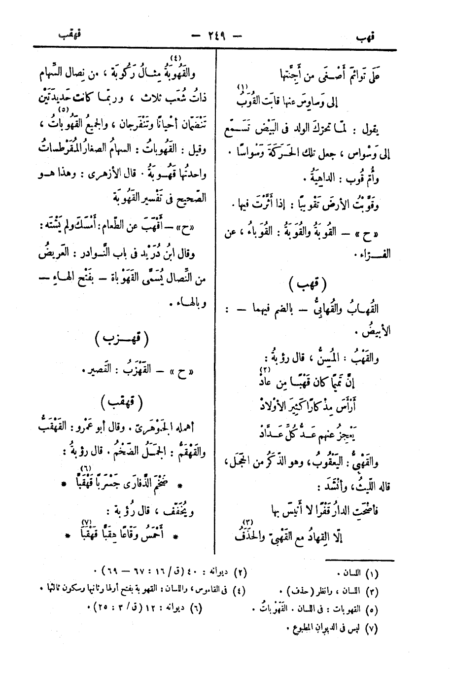 والقَهُوبَةُ، مِثالُ رَكُوبَة: من نِصال السِّهام ذاتُ شُعَب ثلاث، وربّما كانت حَديدَتَيْن تَنْضَمّان أحْيانًا وتَنْفَرجان، والجميعُ القَهُوباتُ، وقيل: القَهُوباتُ: السهامُ الصغارُ المُقَرْطساتُ واحدتُها قَهُوبَةُ. قال الأزهري: وهذا هو الصّحيح في تَفْسير القَهُوبَة.