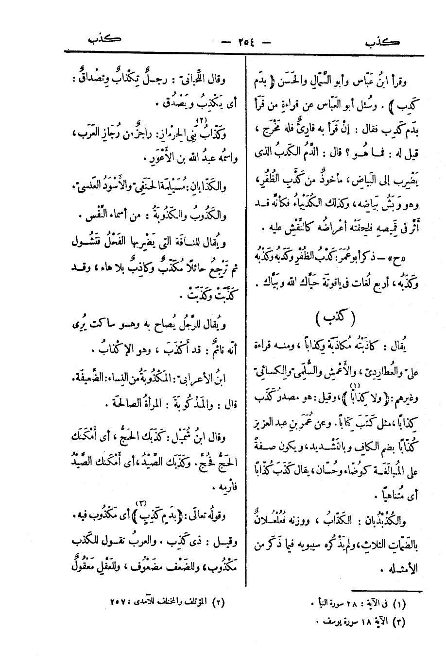 يُقال: كاذَبْتُه مُكاذَبَة وكِذابًا، ومنه قراءة عليّ والعُطارِدِيّ والأَعْمشِ والسُّلَمِيّ والكِسائِيّ وغيرهم: (ولا كِذابًا)، وقيل: هو مصدرُ كَذَب كِذابًا، مثل كَتَبَ كِتابًا. وعن عُمَرَ بنِ عبد العزيز: (كُذّابًا) بضم الكافِ وبالتَشْديد، ويكون صفةً على المُبالَغَة كوُضّاء وحُسّان، يقال كَذَبَ كُذّابًا أي مُتناهيًا.