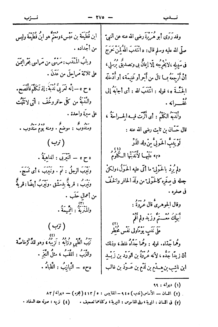 " ح " - إنَّه لعَرَبِيٌّ نُدْبَة: إذا تَكَلَّمَ فأَفْصَح.
