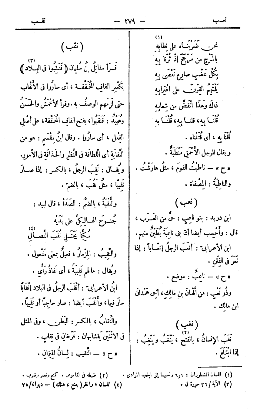 قَرَأ مقاتِلُ بنُ سُليمان: (فَنَقِبُوا في البِلاد) بكَسْرِ القافِ المُخَفَّفة، أي سارُوا في الأَنْقاب حتى لَزِمَهم الوصفُ به. وقرأ الأعْمَشُ والحَسَنُ وعُبَيْدٌ: (فَنَقَبُوا) بفتح القافِ المُخَفَّفة، على أصْلِ الفِعْل، أي سارُوا. وقال ابنُ مِقْسَمٍ: هو من النَّقابَةِ أي اللّطافَة في النَّظرِ والحَذاقَةِ في الأمورِ. ويُقال: نَقِبَ الرجلُ، بالكسر: إذا صارَ نَقِيبًا، مثلُ نَقُبَ بالضمّ.