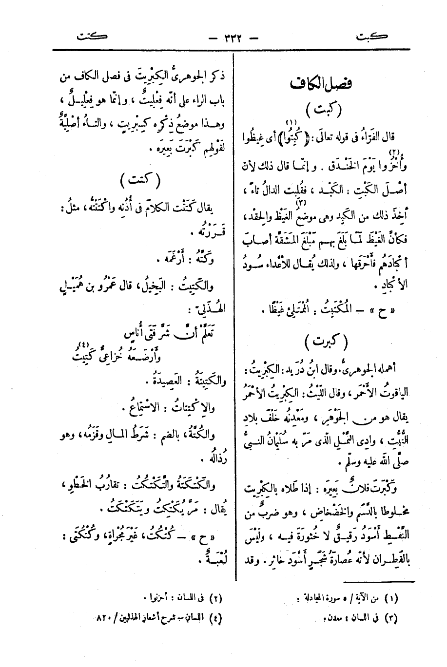 قال الفَرّاءُ في قوله تعالى (كُبِتُوا): أي غِيظُوا وأُخْزُوا يَوْمَ الخَنْدَق. وإنّما قال ذلك لأنّ أصْلَ الكَبْتِ: الكَبْد، فقُلِبت الدالُ تاءً، أخِذَ ذلك من الكَبِد وهي موضعُ الغَيْظ والحِقْد، فكأنَّ الغَيْظَ لَمّا بَلَغَ بهم مَبْلَغَ المَشَقَّة أصابَ أكْبادَهُم فأَحْرَقَها، ولذلك يُقال للأعْداء سُودُ الأكْبادِ.
