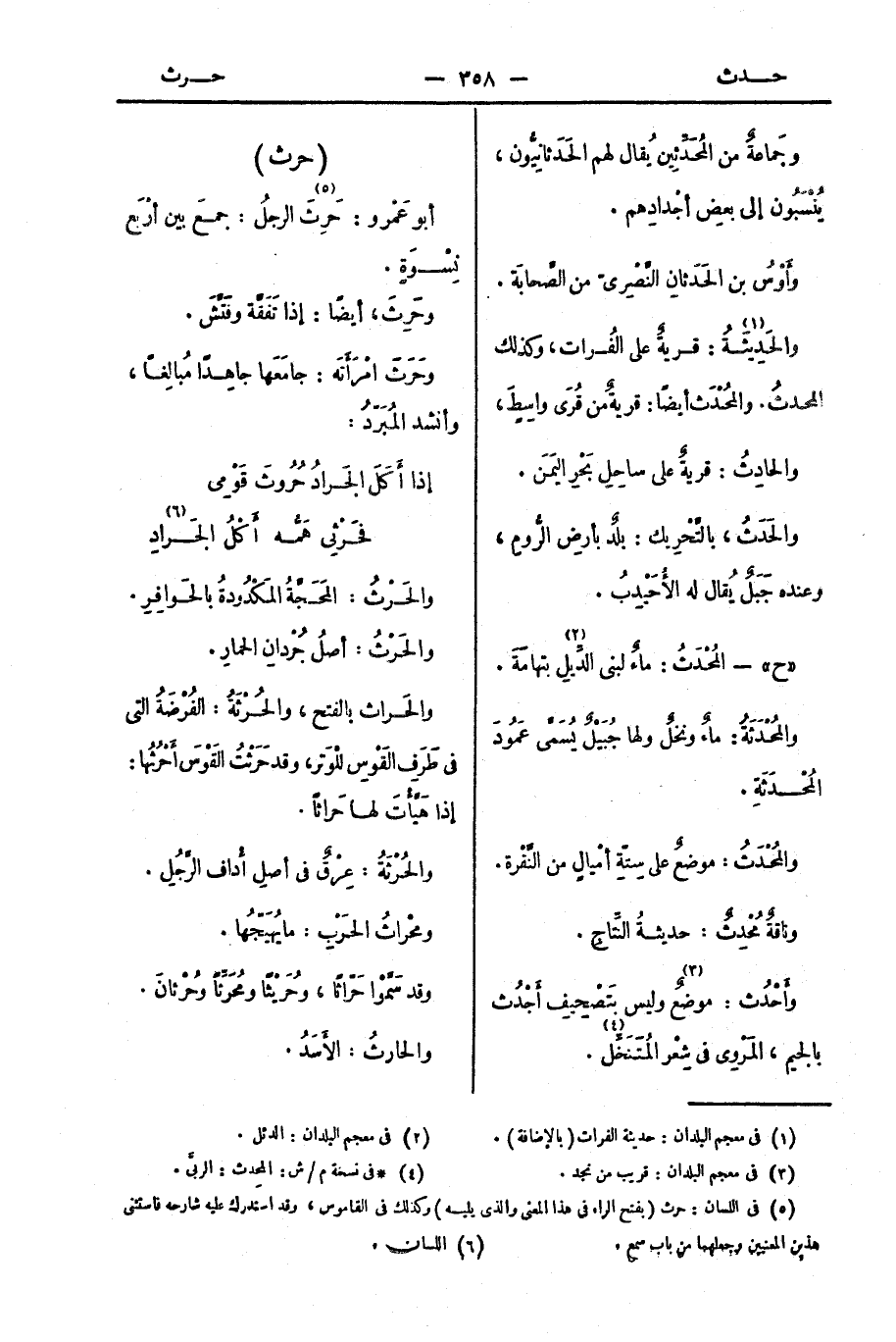 والحَراث بالفتح، والحُرْثَةُ: الفُرْضَةُ التي في طَرَفِ القَوْسِ للْوَتر، وقد حَرَثْتُ القَوْسَ أَحْرُثُها: إذا هَيَّأْتَ لها حَراثًا.