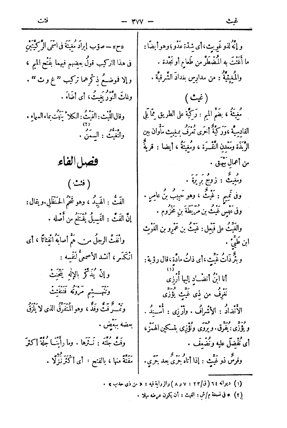 " ح " - صوّب إيرادَ مُغِيثَةَ في اسْمَي الرَّكِيَّتَيْنِ في هذا التركيب قولُ بعضِهم فيهما بفَتْح الميم، وإلا فموضعُ ذِكْرِهما تركيب " غ وث ".