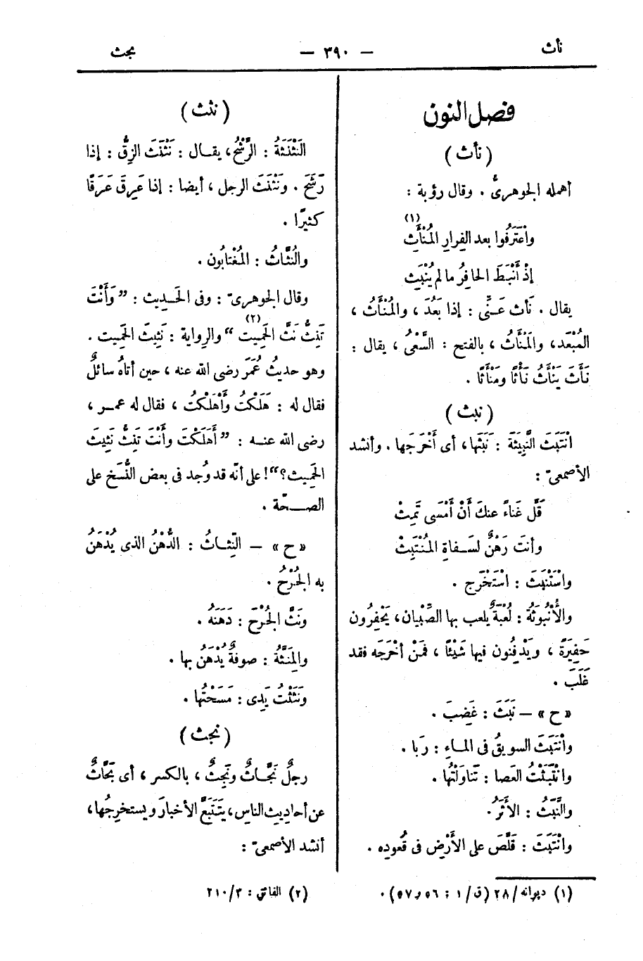 وقال الجوهريّ: وفي الحَدِيث: " وَأَنْتَ تَنِثُّ نَثَّ الحَمِيت " والرِواية: نَثِيثَ الحَمِيت. وهو حديثُ عُمَرَ رضي الله عنه، حين أتاهُ سائلٌ فقال له: هَلَكْتُ وأَهْلَكْتُ، فقال له عمر رضي الله عنه: " أَهَلَكْتَ وأَنْتَ تَنِثُّ نَثِيثَ الحَمِيث؟ ! "، على أنّه قد وُجد في بعض النُّسَخ على الصحّة.