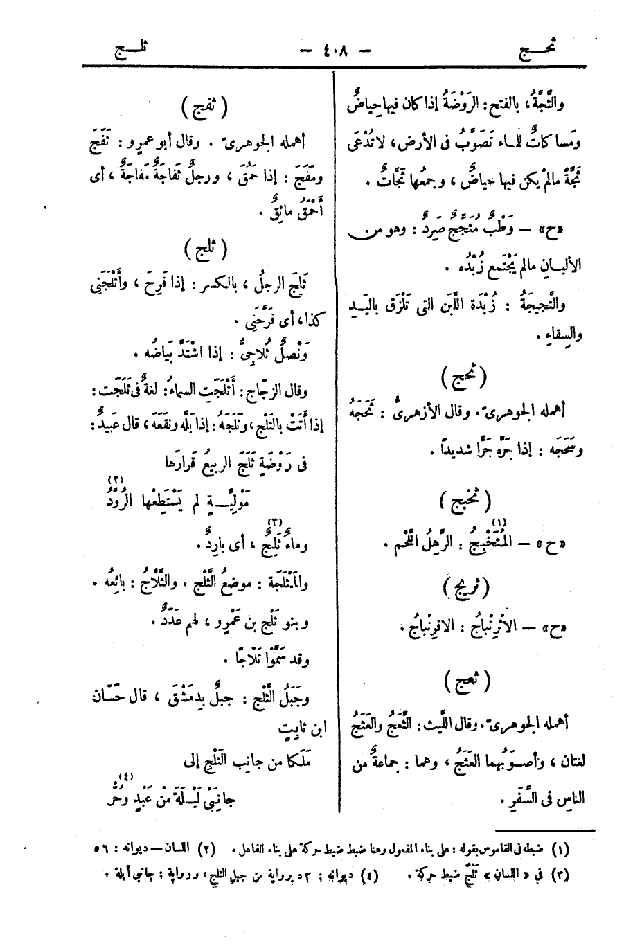 وقال الزجّاج: أَثْلَجَتِ السماءُ، لغةٌ في ثَلَجَت: إذا أَتَتْ بالثَلْج، وثَلَجَهُ: إذا بَلَّه ونَقَعَه، قال عَبيدٌ: