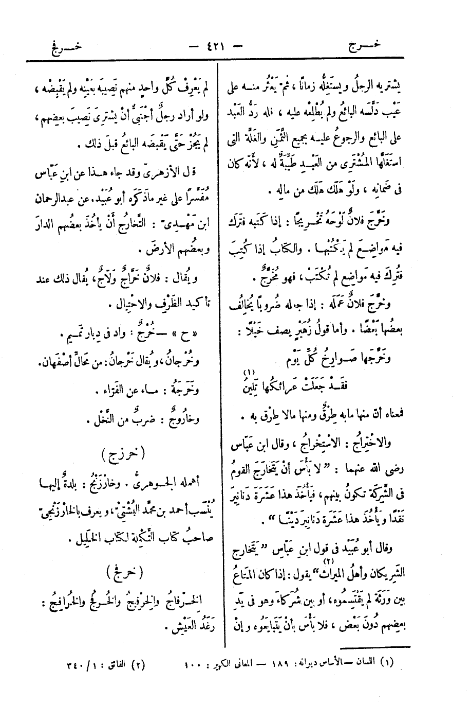 قال الأزهريّ: وقد جاء هذا عن ابنِ عَبّاس مُفَسَّرًا على غير ما ذَكَرَه أبو عُبَيْد. عن عبد الرحمان بن مَهْدِيّ: التَّخارُج أَنْ يأخُذَ بعضُهم الدارَ وبعضُهم الأرضَ.
