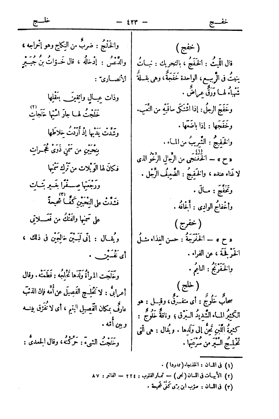 " ح " - الخَفْرَجَةُ: حسن الغِذاء، مثلُ الخَرْفَجَة، عن الفراء.