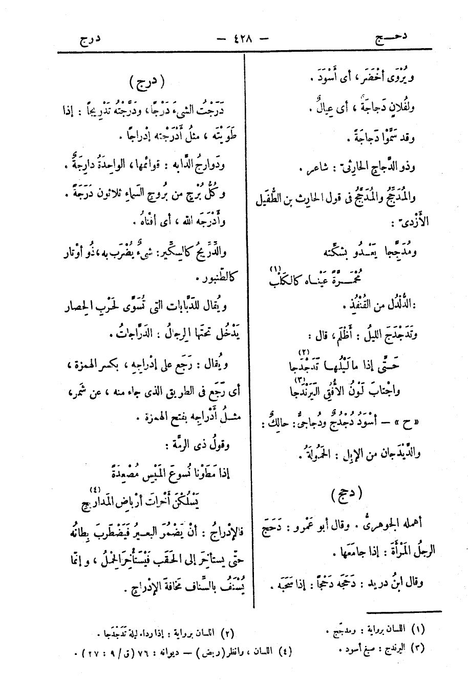 " ح " - أسْوَدُ دُجْدُجٌ ودُجاجيٌّ: حالِكٌ. والدَّيْدَجان من الإبِل: الحَمُولَةُ.
