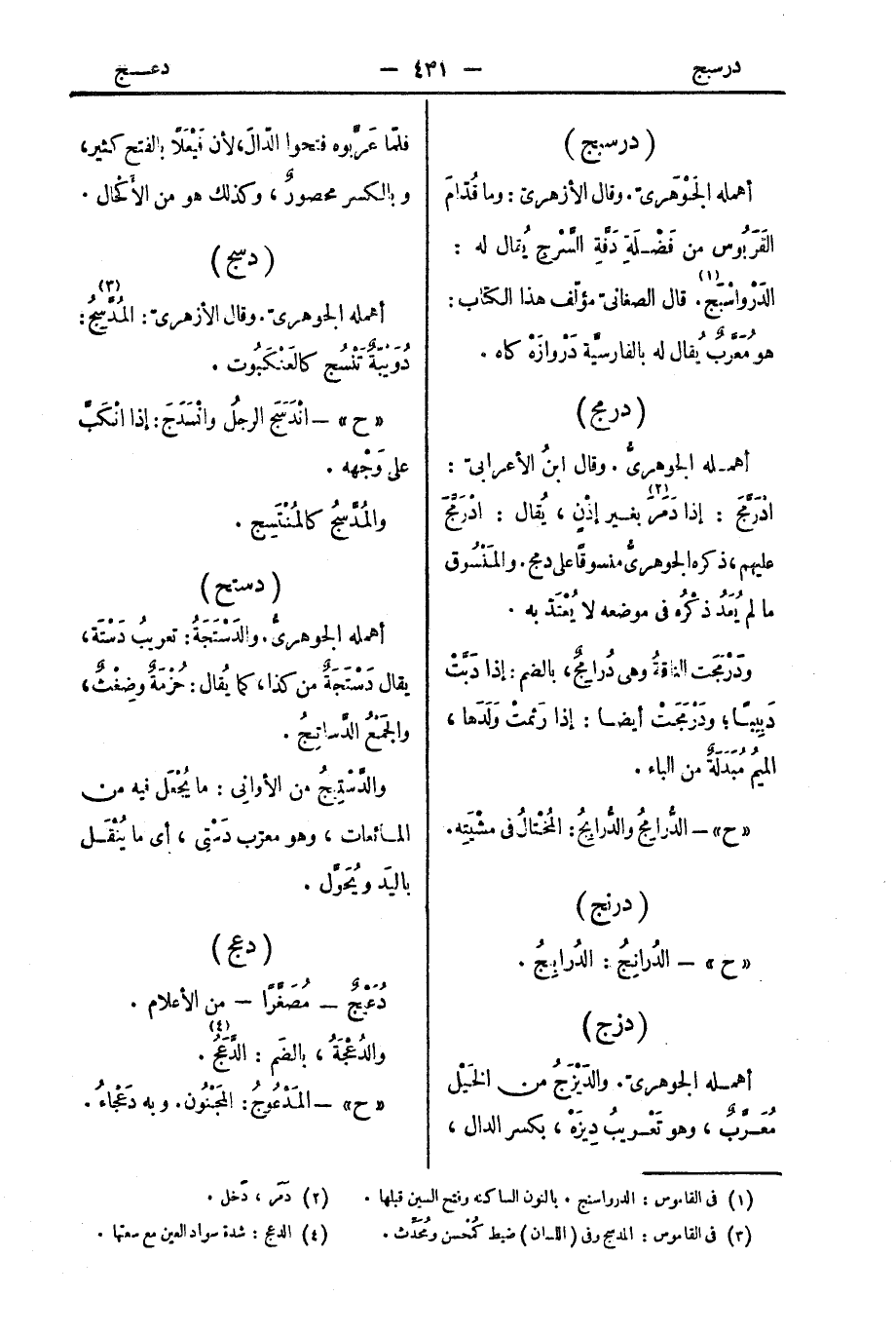 أهمله الجوهريُّ. وقال ابنُ الأعرابيّ: ادْرَمَّجَ: إذا دَمَرَ بغير إذْنٍ، يُقال: ادْرَمَّجَ عليهم، ذكره الجوهريُّ منسوقًا على دمج. والمَنْسُوق ما لم يُعَدْ ذكْرُه في موضعه لا يُعْتَدّ به.