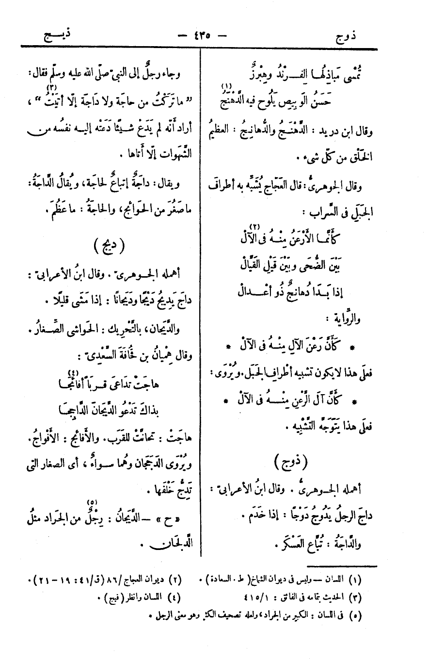 وجاء رجلٌ إلى النبيّ صلى الله عليه وسلم فقال: " ما تَرَكْتُ من حاجَة ولا دَاجَة إلّا أتَيْتُ "، أراد أَنّه لم يَدَعْ شيئًا دَعَتْه إليه نفسُه من الشَّهَوات إلّا أَتاها.