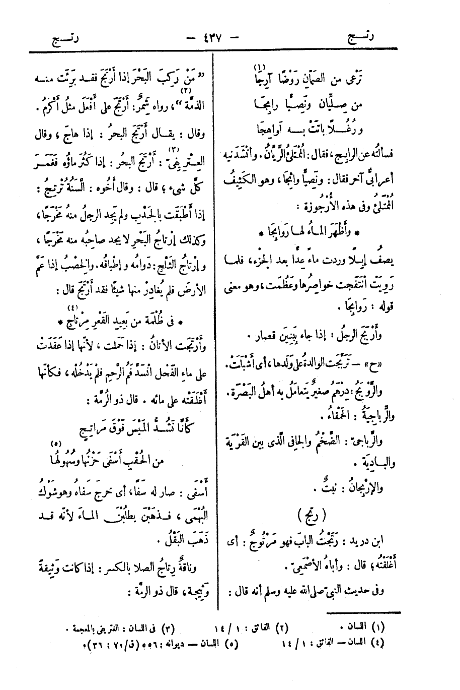 فسألتُه عن الرابِج، فقال: المُمْتَلئُ الرَّيَّانُ. وأنْشَدَنيه أعرابيٌّ آخر فقال: ونَصِيًّا واثِجَا، وهو الكَثِيفُ المُمْتَلئُ، وفي هذه الأُرْجُوزة:
