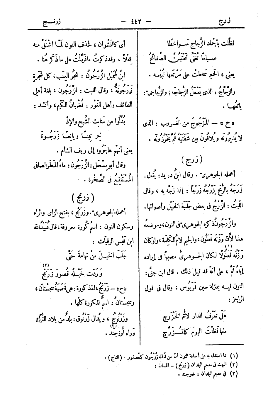 والزَّرَجُونُ ذكره الجوهريّ في النون، وموضعُه هذا لأَنّ وَزْنَه فَعَلُون، والجيم لامُ الكَلِمَة، ولو كان وَزْنُه فَعَلُولًا لكان الجوهريُّ مصيبًا في إيراده إيّاهُ ثَمَّ، على أنّه قد قيل ذلك. قال ابن جنِّي: النون فيه بمنزلة سين قَرَبُوس، وقال في قول الراجز: