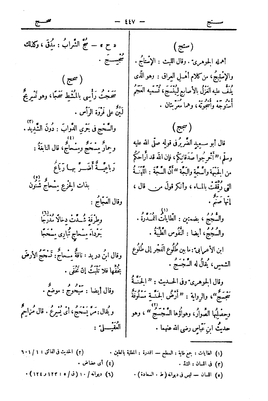 وقال الجوهريّ: وفي الحديث: " الجَنَّةُ سَجْسَجٌ "، والرِواية: " أَرْضُ الجَنَّةِ مَسْلُوفَةٌ، وحِصْلِبُها الصِّوارُ، وهواؤُها السَّجْسَجُ "، وهو حديثُ ابنِ عَبّاسٍ رضي الله عنهما.