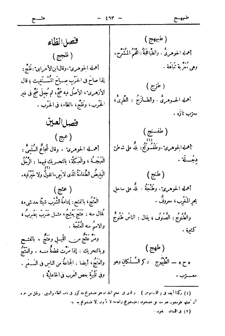 أهمله الجوهريّ. وقال ابن الأعرابيّ: ظَجَّ: إذا صاحَ في الحَرْبِ صِياحَ المُسْتَغِيث؛ قال الأزهريّ: الأصلُ فيه ضَجَّ، ثم جُعِلَ ضَجَّ في غير الحَرْب، وظَجَّ، بالظاء، في الحَرْب.
