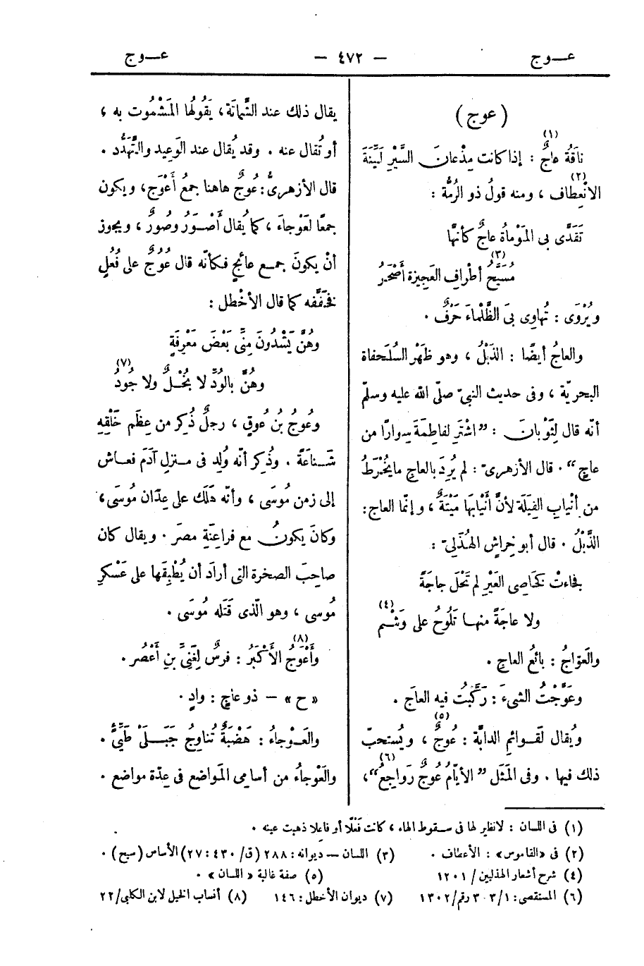 ويُقال لقَوائمِ الدابَّة: عُوجٌ، ويُستحبّ ذلك فيها. وفي المَثَل: " الأيّامُ عُوجٌ رَواجِعُ "، يقال ذلك عند الشَّماتَة، يَقُولُها المَشْمُوت به، أو تُقال عنه. وقد يُقال عند الوَعِيد والتَّهَدُّد. قال الأزهريُّ: عُوجٌ هاهنا جمعُ أَعْوَج، ويكون جمعًا لعَوْجاءَ، كما يُقال أَصْوَرُ وصُورٌ، ويجوز أنْ يكونَ جمع عائجٍ، فكأنّه قال عُوُجٌ على فُعُلٍ فخَفَّفه، كما قال الأخْطل:
