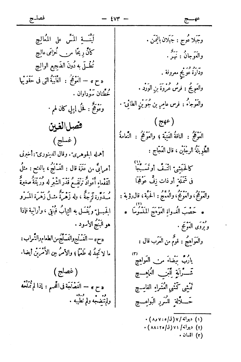 " ح " - الغَسْلَج والغَسَلَّجُ من الطعام والشَّراب: ما لا تَجِدُ له طَعْمًا؛ والأمرُ بين الأَمْرَيْن أيضا.