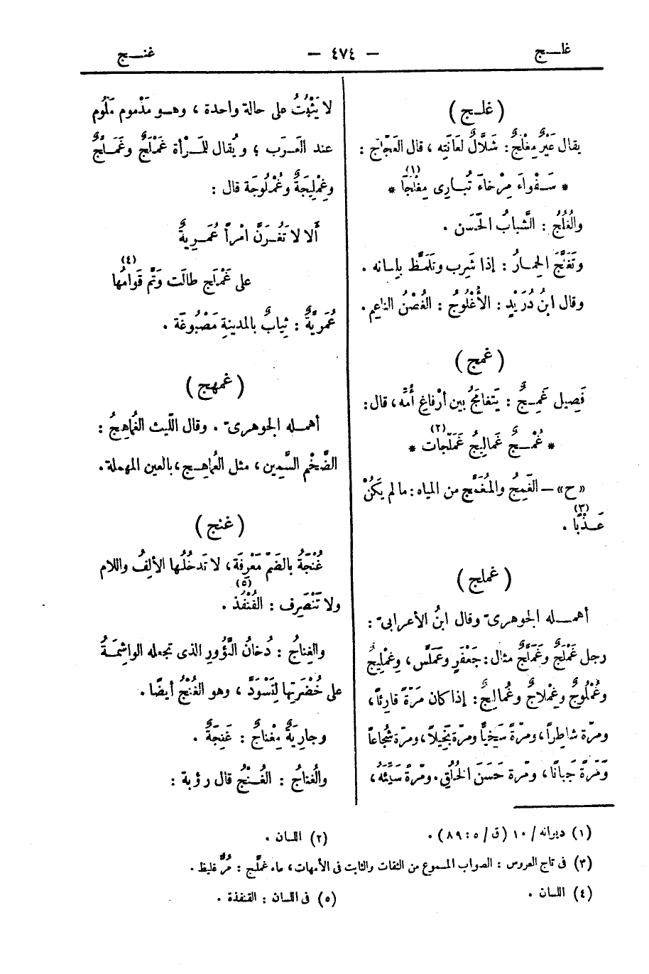 أهمله الجوهريّ وقال ابنُ الأعرابيّ: رجل غَمْلَجٌ وغَمَلَّجٌ، مثال جَعْفَرٍ وعَمَلَّس، وغِمْلِيجٌ وغُمْلُوجٌ وغِمْلاجٌ وغُمالِجٌ: إذا كان مَرّةً قارِئًا ومرّةً شاطِرًا، ومرّةً سَخِيًّفا ومرّةً بَخِيلًا، ومرّةً شُجاعًا ومَرّةً جَبانًا، ومرّةً حَسَنَ الخُلُقِ ومرّةً سَيِّئَهُ، لا يَثْبُتُ على حالة واحدة، وهو مَذْموم مَلُوم عند العَرَب؛ ويُقال للمَرْأة غَمْلَجٌ وغَمَلّجٌ وغِمْلِيجَةٌ وغُمْلُوجَة، قال:
