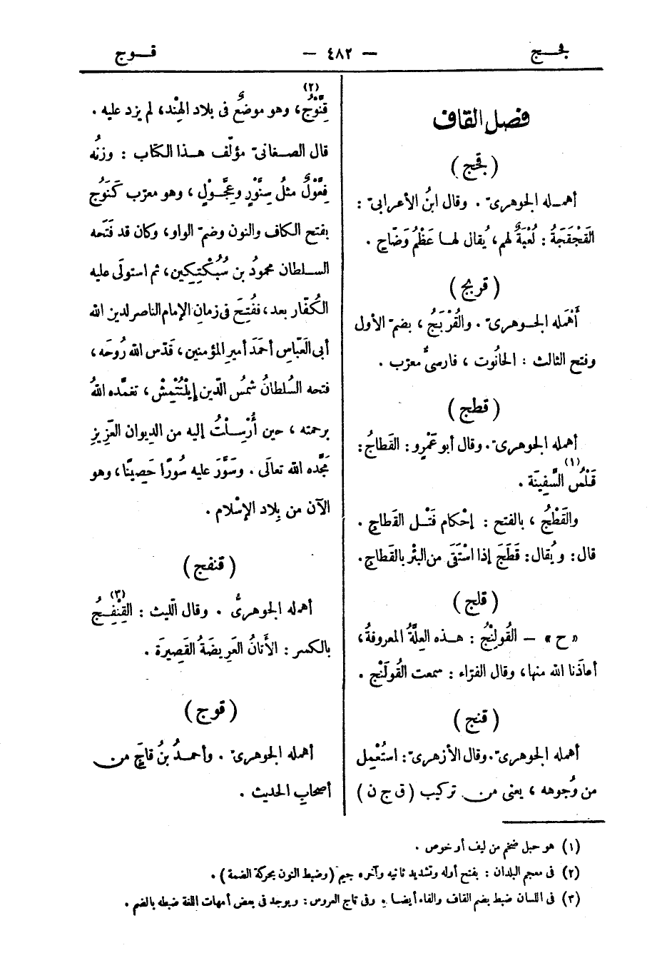 أهمله الجوهريّ. وقال الأزهريّ: استُعْمِل من وُجوهه، يعني من تركيب (ق ج ن) قِنَّوْجُ، وهو موضعٌ في بلاد الهِنْد، لم يزد عليه. قال الصنعانيّ مؤلّف هذا الكتاب: وزنُه فِعَّوْلٌ مثلُ سِنَّوْرٍ وعِجَّوْلٍ، وهو معرّب كَنَوُج، بفتح الكاف والنون وضمّ الواو، وكان قد فَتَحه السلطان محمودُ بن سُبُكْتِكِين، ثم استولَى عليه الكُفّار بعد، ففُتِحَ في زمانِ الإمام الناصر لدين الله أبي العَبّاسِ أحمَدَ أميرِ المؤمنين، قَدّس الله رُوحَه، فتحه السُلطانُ شمسُ الدّين إيلْتُتْمِشْ، تغمَّده اللهُ برحمته، حين أُرْسِلْتُ إليه من الدِيوان العَزِيزِ مَجَّده الله تعالى. وسَوَّرَ عليه سُورًا حَصِينًا، وهو الآن من بِلاد الإسْلام.