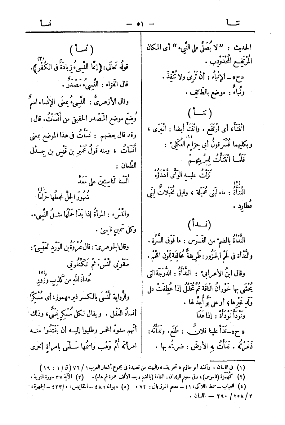 وقال الأزهريُّ: النَّسِيءُ بمعنَى الإنْساء اسمٌ وُضِعَ موضع المَصْدر الحقيقي من أَنْسَأتُ. قال: وقد قال بعضهم: نسَأْتُ في هذا الموضع بمعنى أَنْسَأتُ، ومنه قَولُ عُمَيْرِ بن قَيْسِ بن جِذْل الطّعان: