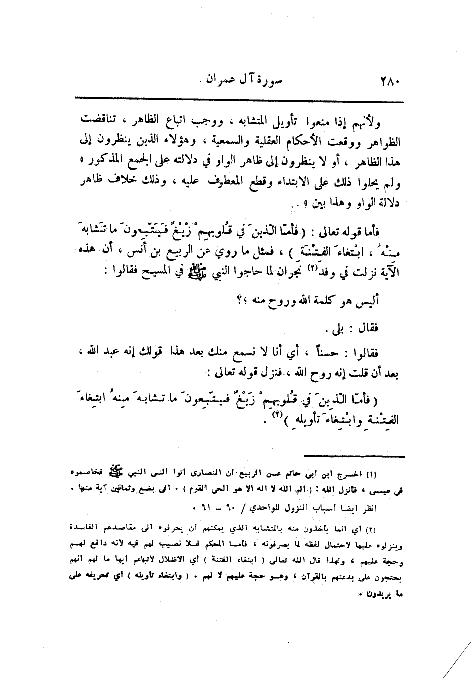 فأما قوله تعالى: (فَأَمَّا الَّذِينَ فِي قُلُوبِهِمْ زَيْغٌ فَيَتَّبِعُونَ ما تَشابَهَ مِنْهُ، ابْتِغاءَ الْفِتْنَةِ) ، فمثل ما روي عن الربيع بن أنس، أن هذه الآية نزلت في وفد «1» نجران لما حاجوا النبي صلّى الله عليه وسلم في المسيح فقالوا: