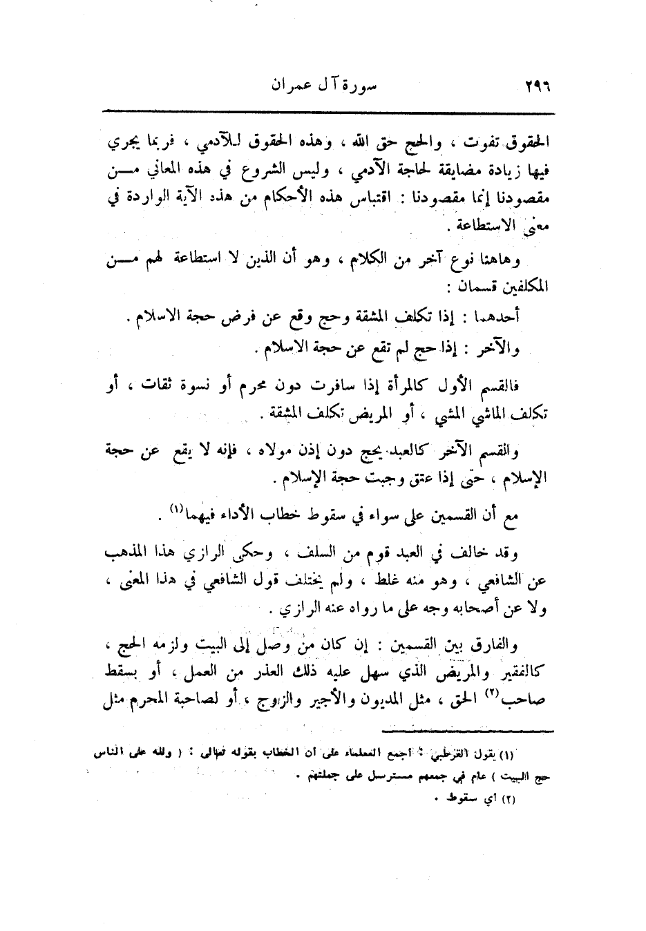 (1) يقول القرطبي: أجمع العلماء على أن الخطاب بقوله تعالى: (وَلِلَّهِ عَلَى النَّاسِ حِجُّ الْبَيْتِ) عام في جمعهم مسترسل على جملتهم.