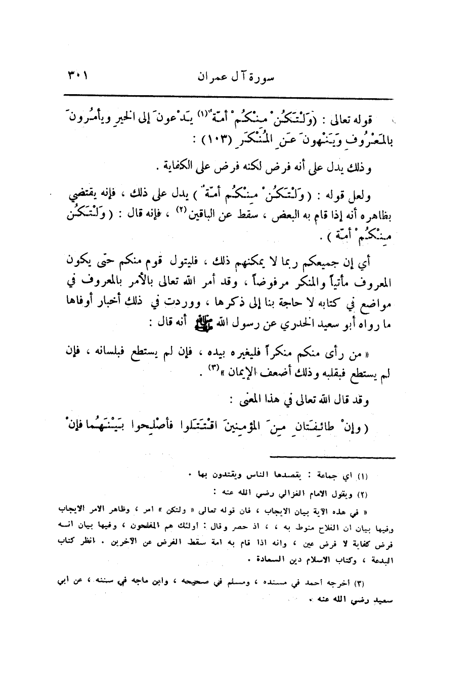 «في هذه الآية بيان الإيجاب، فان قوله تعالى «ولتكن» امر، وظاهر الأمر الإيجاب وفيها بيان ان الفلاح منوط به،، إذ حصر وقال: أولئك هم المفلحون، وفيها بيان انه فرض كفاية لا فرض عين، وانه إذا قام به امة سقط الفرض عن الآخرين. انظر كتاب البدعة، وكتاب الإسلام دين السعادة. [.....]