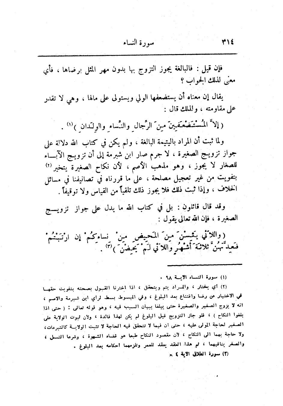 (2) أي يختار، والمراد يتم ويتحقق، إذا أخترنا القول بصحته بتفويت حقها في الاختيار عن رضا واقتناع بعد البلوغ، وفي المبسوط بسط لرأي ابن شبرمة والأصم، أنه لا يزوج الصغير والصغيرة حتى يبلغا ببيان السبب فيه، وهو قوله تعالى: (حَتَّى إِذا بَلَغُوا النِّكاحَ) ، فلو جاز التزويج قبل البلوغ لم يكن لهذا فائدة، ولأن ثبوت الولاية على الصغير لحاجة المولى عليه، حتى ان فيما لا تتحقق فيه الحاجة لا تثبت الولاية كالتبرعات، ولا حاجة بهما الى النكاح، لأن مقصود النكاح طبعا هو قضاء الشهوة، وشرعا النسل، والصغر ينافيهما، ثم هذا العقد يعقد للعمر وتلزمهما أحكامه بعد البلوغ. [.....]