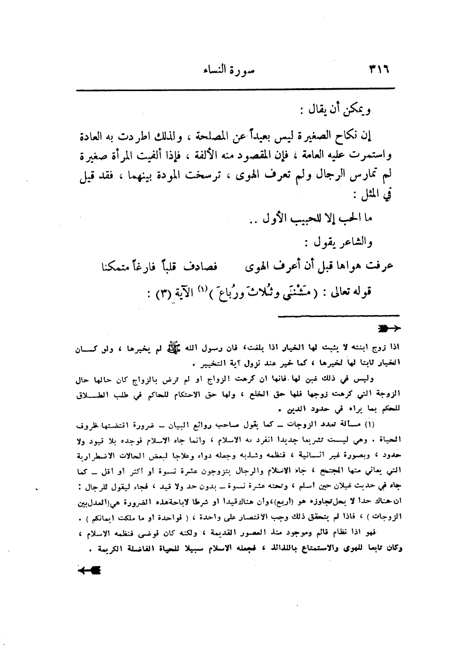 (1) مسألة تعدد الزوجات- كما يقول صاحب روائع البيان- ضرورة اقتضتها ظروف الحياة. وهي ليست تشريعا جديدا انفرد به الإسلام، وانما جاء الإسلام فوجده بلا قيود ولا حدود، وبصورة غير انسانية، فنظمه وشذ به وجعله دواء وعلاجا لبعض الحالات الاضطرارية التي يعاني منها المجتمع، جاء الإسلام والرجال يتزوجون عشرة نسوة أو أكثر أو أقل- كما جاء في حديث غيلان حين أسلم، وتحته عشرة نسوة- بدون حد ولا قيد، فجاء ليقول للرجال: