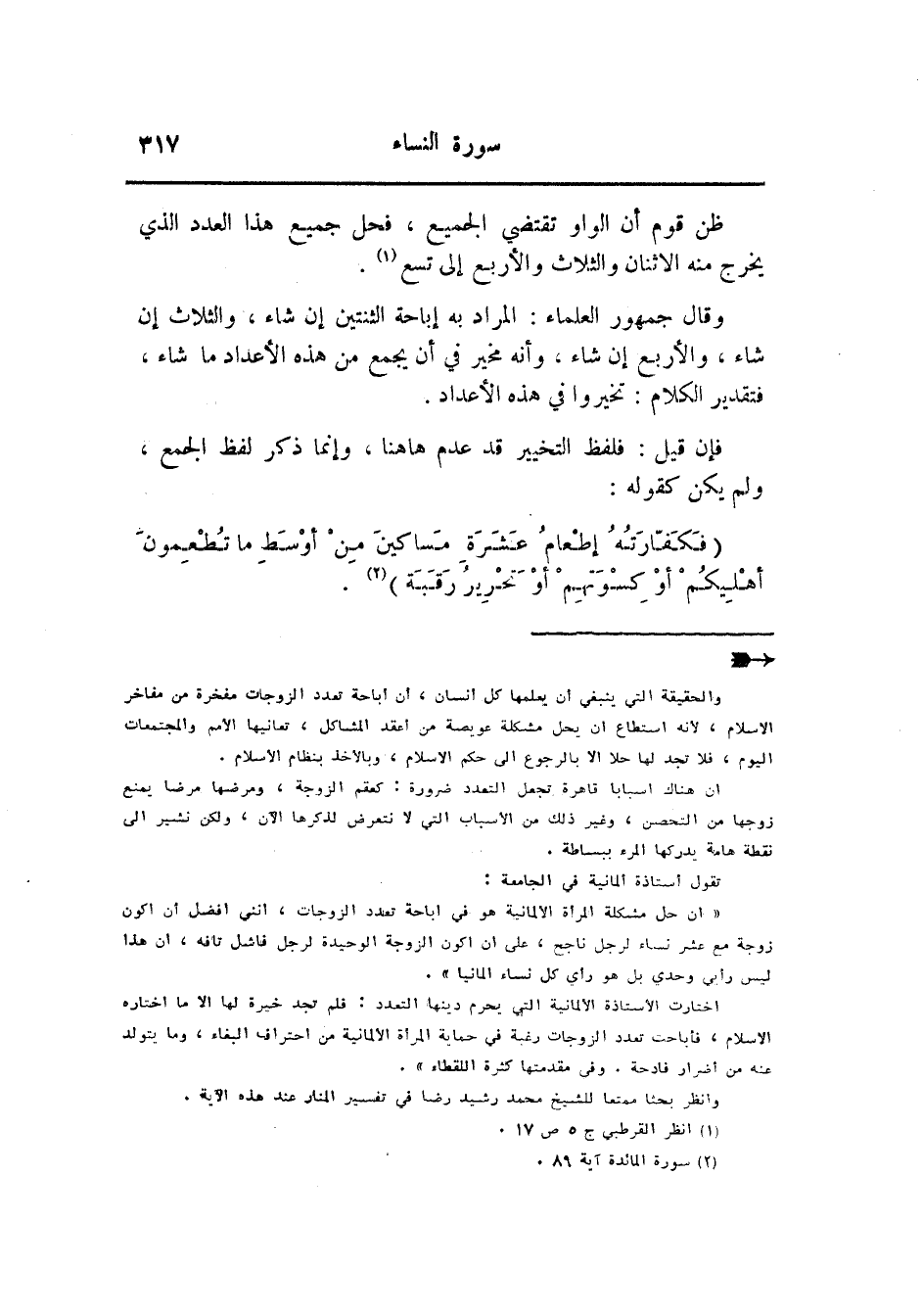 ظن قوم أن الواو تقتضي الجميع، فحل جميع هذا العدد الذي يخرج منه الاثنان والثلاث والأربع إلى تسع «1» .
