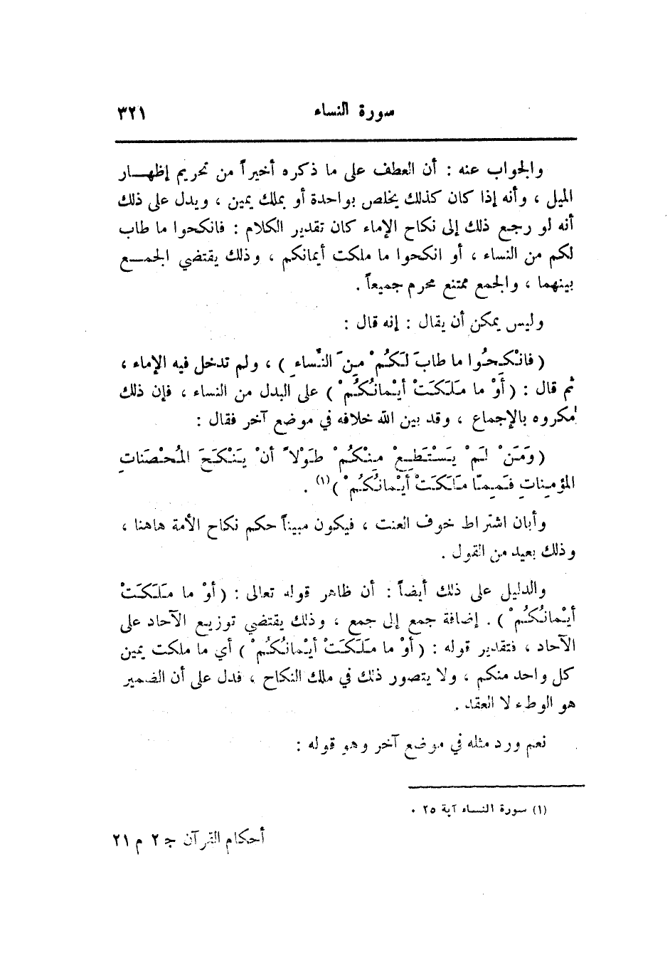 والدليل على ذلك أيضا: أن ظاهر قوله تعالى: (أَوْ ما مَلَكَتْ أَيْمانُكُمْ) . إضافة جمع إلى جمع، وذلك يقتضي توزيع الآحاد على الآحاد، فتقدير قوله: (أَوْ ما مَلَكَتْ أَيْمانُكُمْ) أي ما ملكت يمين كل واحد منكم، ولا يتصور ذلك في ملك النكاح، فدل على أن الضمير هو الوطء لا العقد.