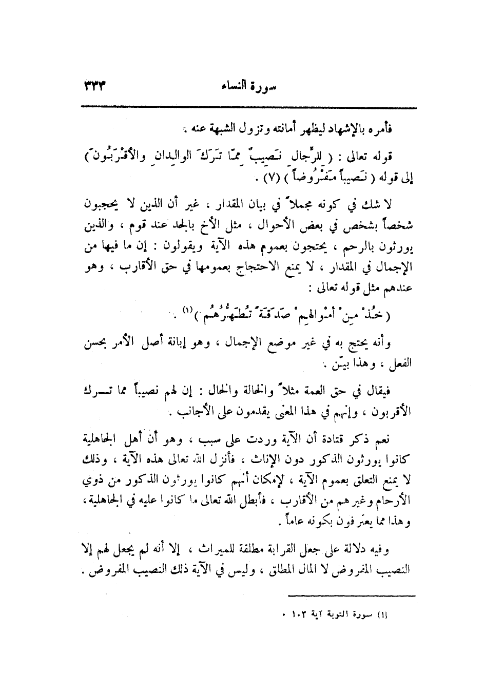 لا شك في كونه مجملا في بيان المقدار، غير أن الذين لا يحجبون شخصا بشخص في بعض الأحوال، مثل الأخ بالجد عند قوم، والذين يورثون بالرحم، يحتجون بعموم هذه الآية ويقولون: إن ما فيها من الإجمال في المقدار، لا يمنع الاحتجاج بعمومها، في حق الأقارب، وهو عندهم مثل قوله تعالى: