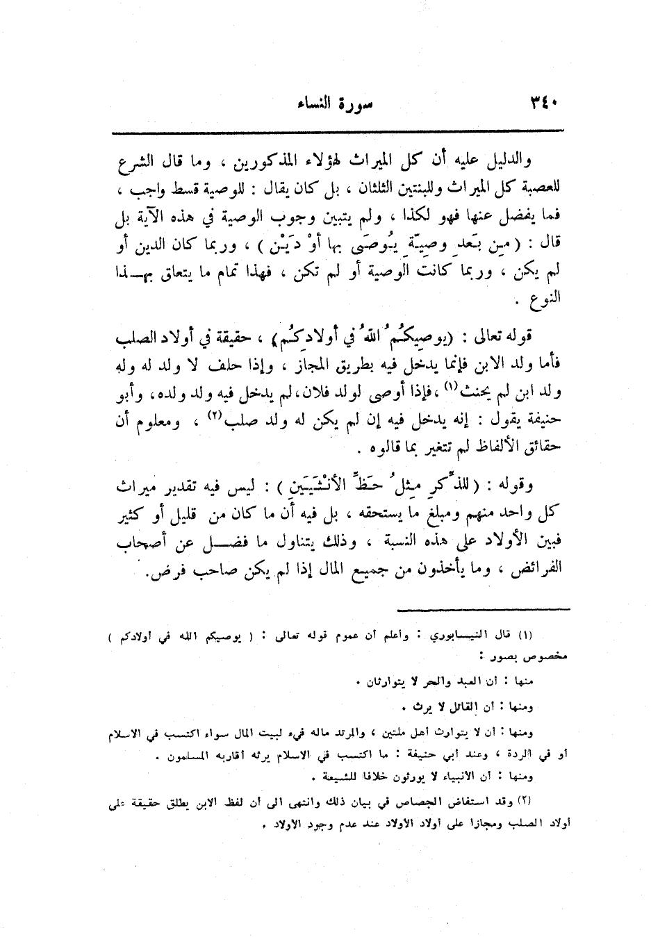 (2) وقد استفاض الجصاص في بيان ذلك وانتهى الى أن لفظ الابن يطلق حقيقة على أولاد الصلب ومجازا على أولاد الأولاد عند عدم وجود الأولاد.