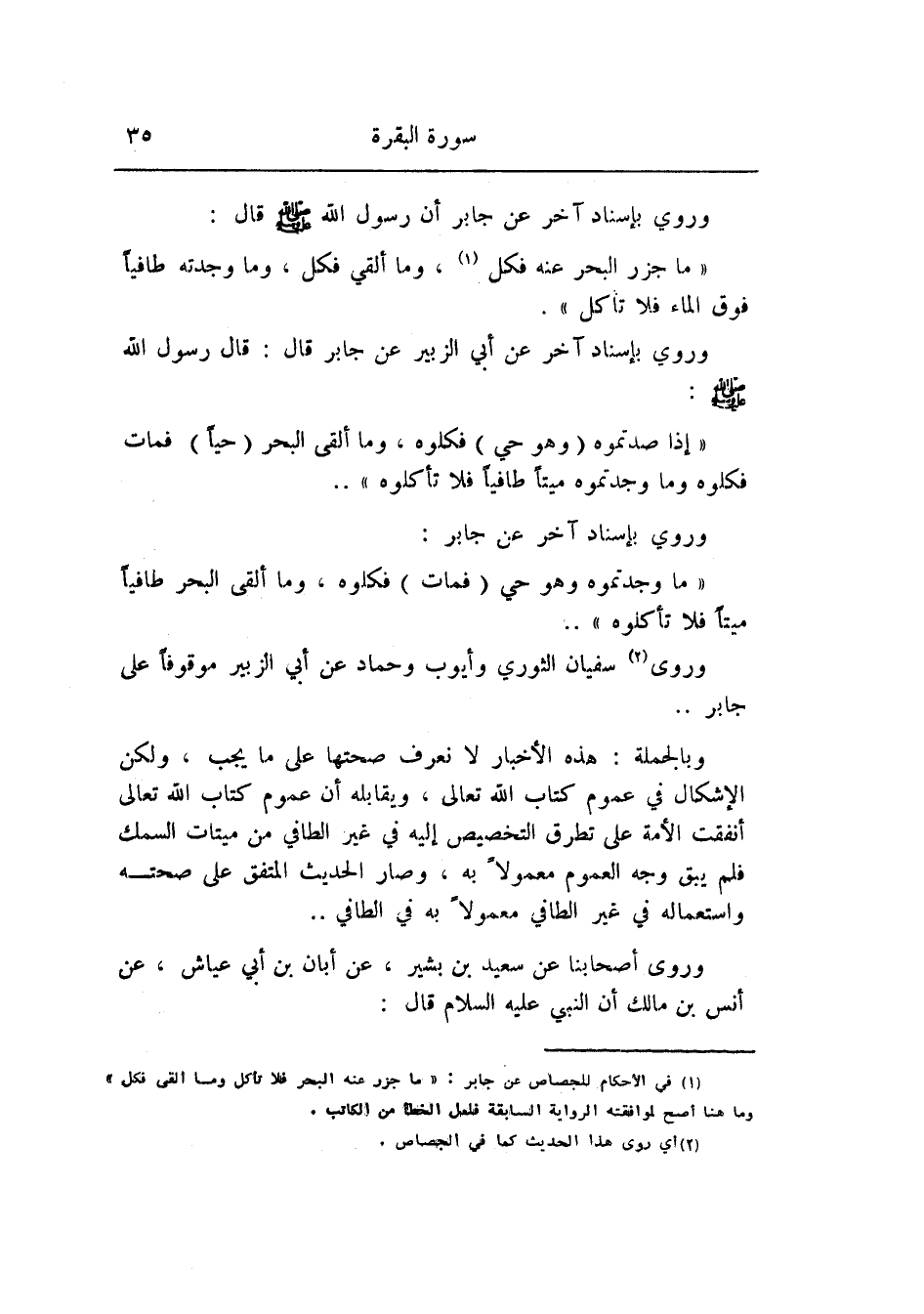 (1) في الأحكام للجصاص عن جابر: «ما جزر عنه البحر فلا تأكل وما ألقى فكل» وما هنا أصح لموافقته الرواية السابقة فلعل الخطأ من الكاتب.