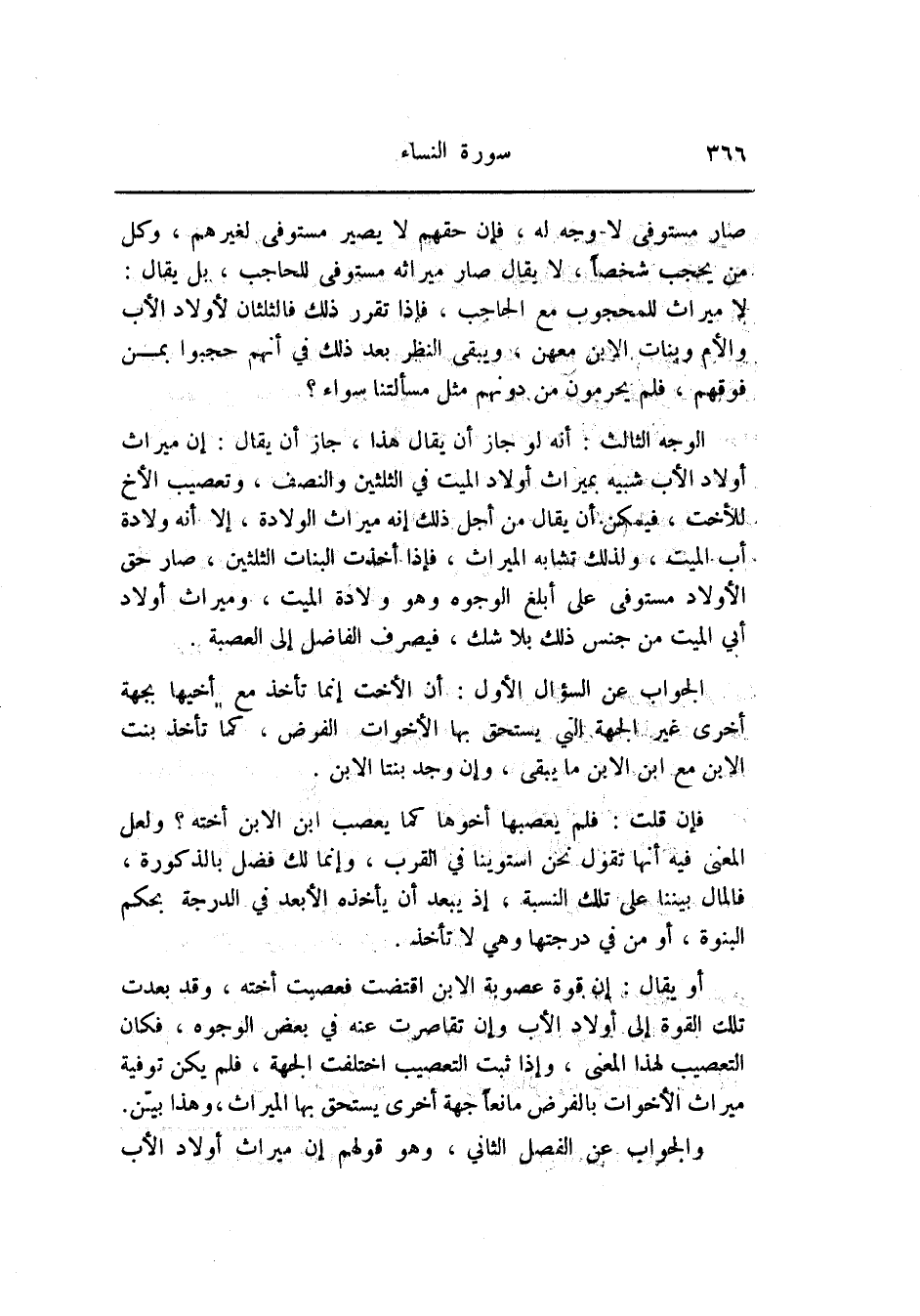 أو يقال: إن قوة عصوبة الابن اقتضت فعصبت أخته، وقد بعدت تلك القوة إلى أولاد الأب وإن تقاصرت عنه في بعض الوجوه، فكان التعصيب لهذا المعنى، وإذا ثبت التعصيب اختلفت الجهة، فلم يكن توفية ميراث الأخوات بالفرض مانعا جهة أخرى يستحق بها الميراث، وهذا بيّن.