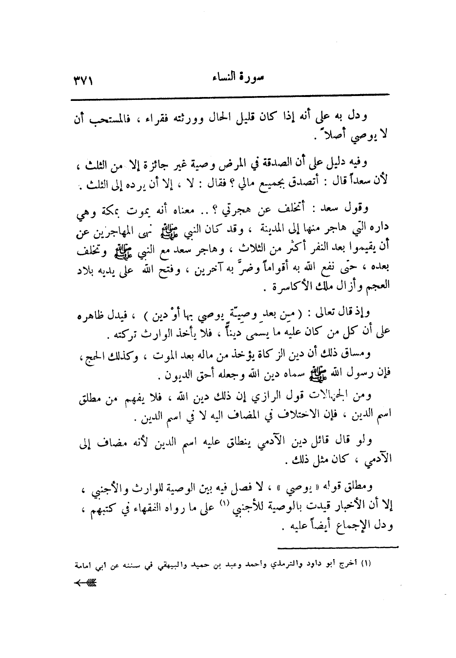 (1) أخرج أبو داود والترمذي وأحمد وعبد بن حميد والبيهقي في سننه عن أبي أمامة الباهلي قال: سمعت رسول الله صلّى الله عليه وسلم في حجة الوداع في خطبته يقول: ان الله أعطى كل ذي حق حقه، فلا وصية لوارث، راجع فتح الباري في هذا الباب.