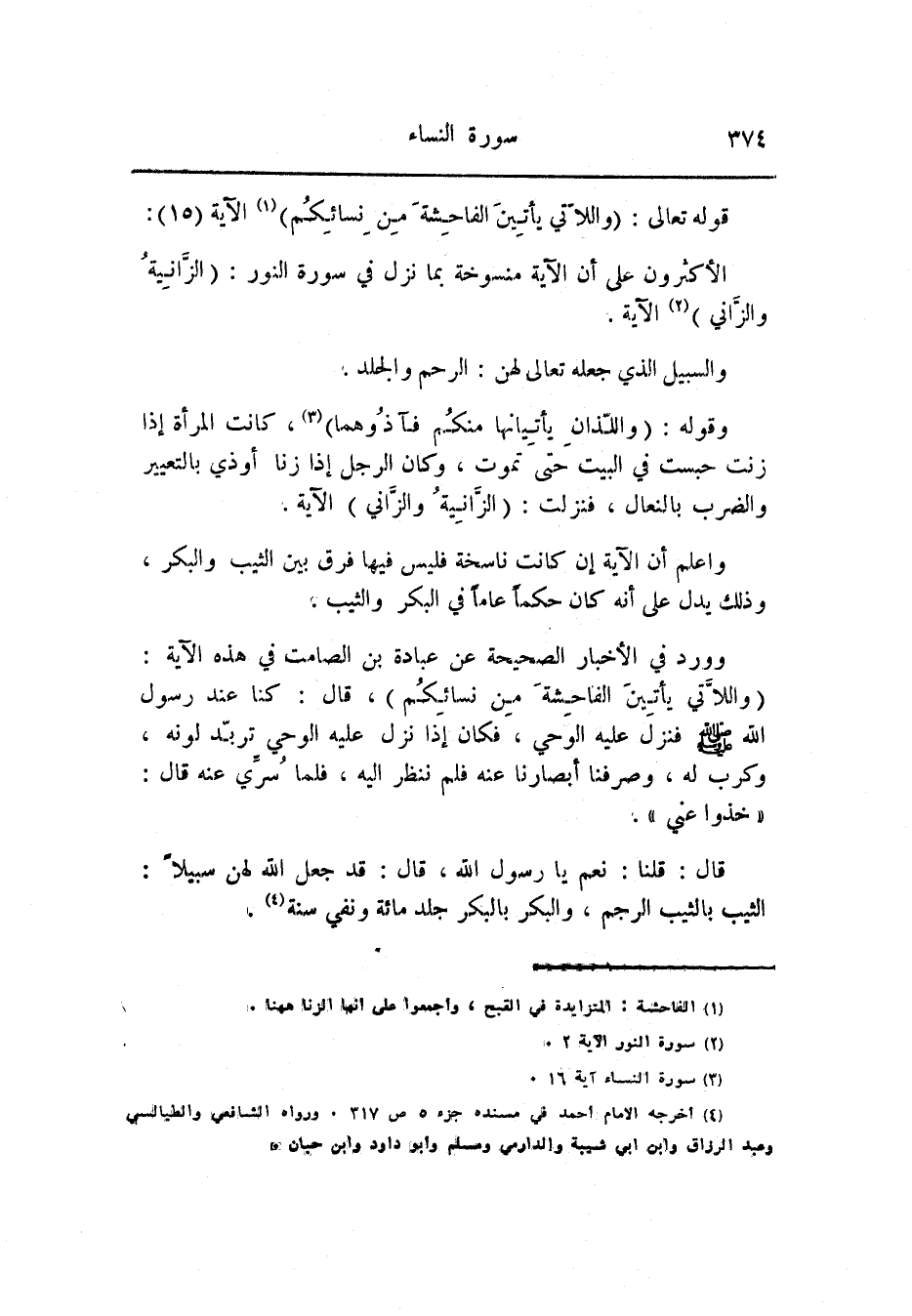 وقوله: (وَالَّذانِ يَأْتِيانِها مِنْكُمْ فَآذُوهُما) «3» ، كانت المرأة إذا زنت حبست في البيت حتى تموت، وكان الرجل إذا زنا أوذي بالتعيير والضرب بالنعال، فنزلت: (الزَّانِيَةُ وَالزَّانِي) الآية.