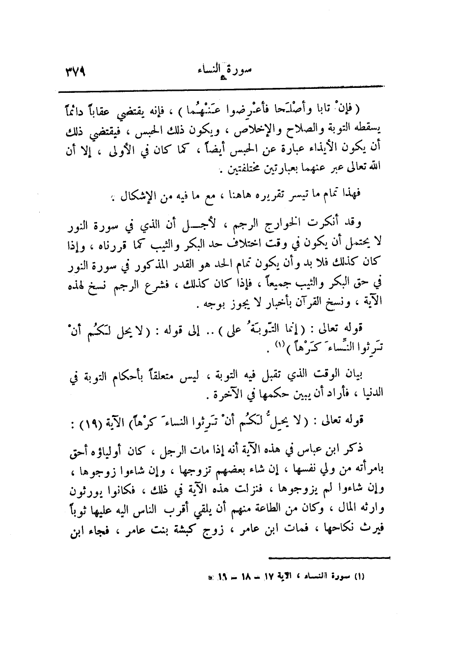 قوله تعالى: (إِنَّمَا التَّوْبَةُ عَلَى) .. إلى قوله: (لا يَحِلُّ لَكُمْ أَنْ تَرِثُوا النِّساءَ كَرْهاً) «1» .