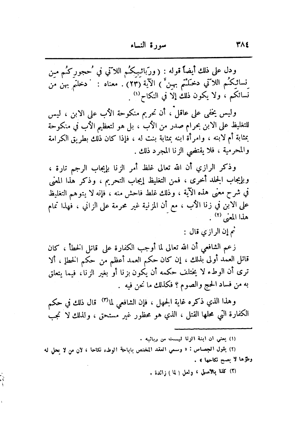 وذكر الرازي أن الله تعالى غلظ أمر الزنا بإيجاب الرجم تارة، وبإيجاب الجلد أخرى، فمن التغليظ إيجاب التحريم، وذكر هذا المعنى في شرح معنى هذه الآية، وذلك غلط فاحش منه، فإنه لا يتوهم التغليظ على الابن في زنا الأب، مع أن المزنية غير محرمة على الزاني، فهذا تمام هذا المعنى «2» .