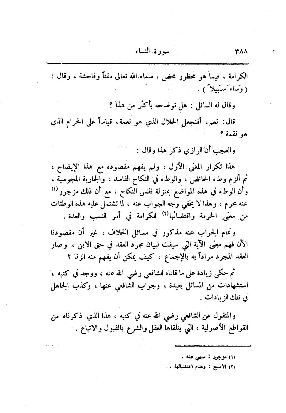 هذا تكرار المعنى الأول، ولم يفهم مقصوده مع هذا الإيضاح، ثم ألزم وطء الحائض، والوطء في النكاح الفاسد، والجارية المجوسية، وأن الوطء في هذه المواضع بمنزلة نفس النكاح، مع أن ذلك مزجور «1» عنه محرم، وهذا لا يخفي وجه الجواب عنه، لما تشتمل عليه هذه الوطئات من معنى الحرمة واقتضائها «2» للكرامة في أمر النسب والعدة، وتمام الجواب عنه مذكور في مسائل الخلاف، غير أن مقصودنا الآن فهم معنى الآية التي سيقت لبيان مجرد العقد في حق الابن، وصار العقد المجرد مرادا به بالإجماع، كيف يمكن أن يفهم منه الزنا؟