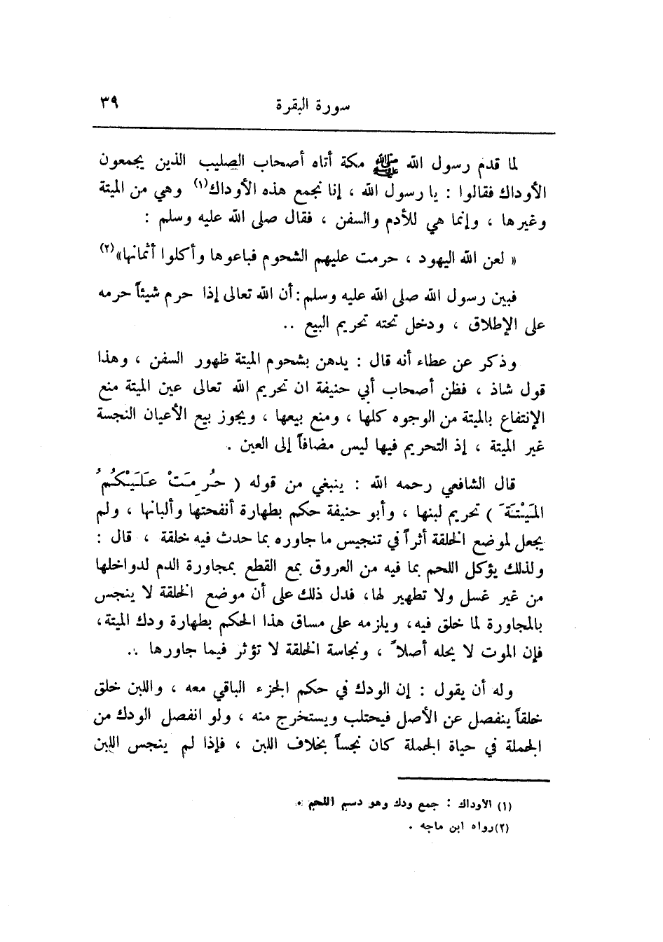 ولذلك يؤكل اللحم بما فيه من العروق بمع القطع بمجاورة الدم لدواخلها من غير غسل ولا تطهير لها، فدل ذلك على أن موضع الخلقة لا ينجس بالمجاورة لما خلق فيه، ويلزمه على مساق هذا الحكم بطهارة ودك الميتة، فإن الموت لا يحله أصلا، ونجاسة الخلقة لا تؤثر فيما جاورها..
